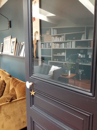 C’est le long d’un mur de plus de six mètres de long que le projet s’est développé. Tout d’abord avec la création d’un banc coffre dans l’entrée, puis d’une grande bibliothèque bureau, munie de suffisamment de rangements, afin de cacher la partie informatique et les nombreux dossiers. Le choix de couleurs fortes a rythmé le projet et les différents espaces.